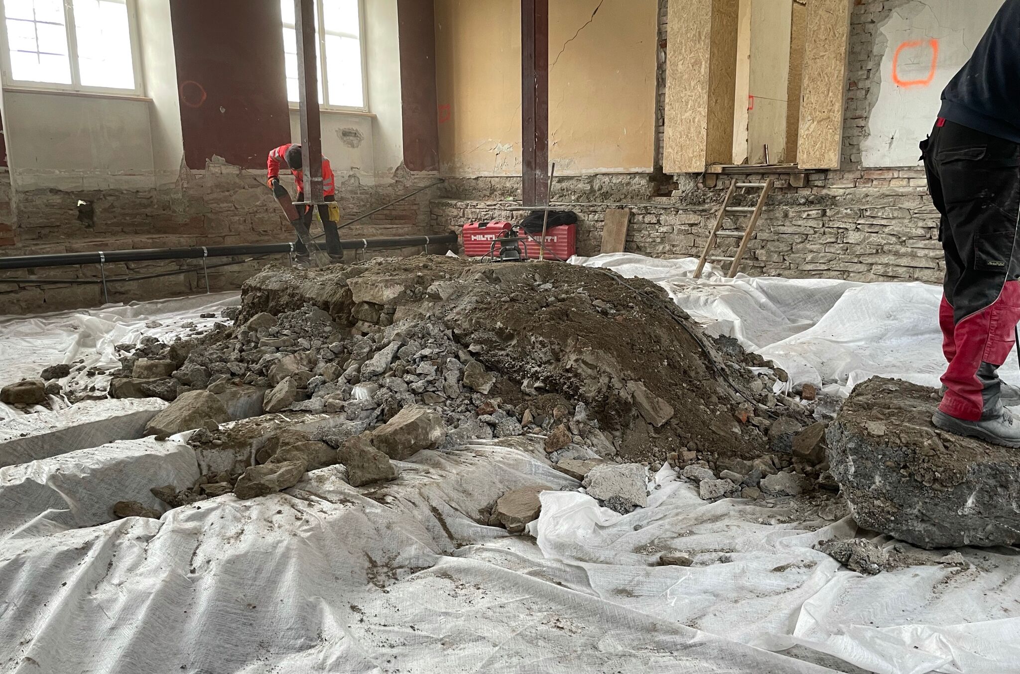 Die Bauarbeiten im Osttrakt kommen gut voran. In den vergangenen zwei Wochen wurden z.B. Rohre verlegt, die Kiesschüttung und der Beton eingebracht. In dieser Woche werden nun u.a. tragende Balken verstärkt.